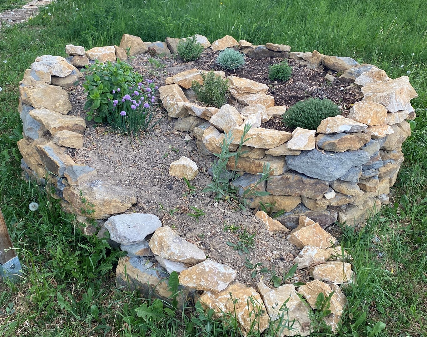 Der trockene Bereich der Kräuterspirale bietet Platz für Thymian, Rosmarin, Lavendel, Oregano, Salbei und Currykraut.