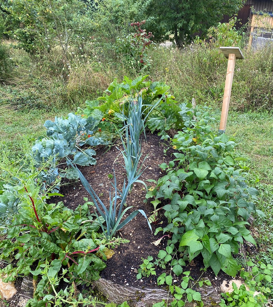 Details: Hier wachsen Obst, Gemüse und Kräuter. Durch das Mulchen mit organischem Material aus der Pufferzone und der Hotspot-Zone schließen wir den Nährstoffkreislauf, ohne künstlichen Dünger zu benötigen.